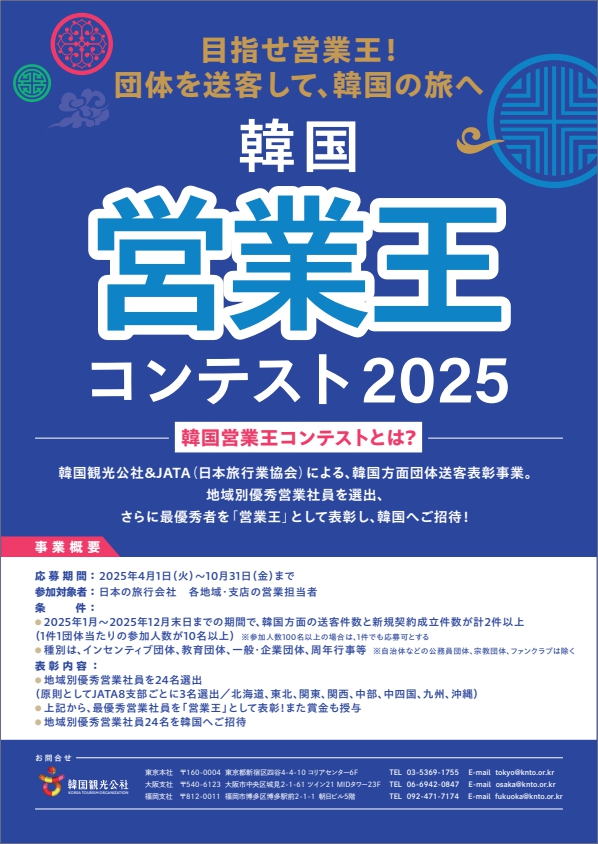 【韓国営業王コンテストとは?】 韓国観光公社&JATA(日本旅行業協会)による、韓国方面団体送客表彰事業。 地域別優秀営業社員を選出、さらに最優秀者を「営業王」として表彰し、韓国へご招待いたします! 【応募期間】 2025年4月1日(火)~10月31日(金)まで 【参加対象者】 日本の旅行会社 各地域・支店の営業担当者 【条件】 ・2025年1月~2025年12月末日までの期間で、韓国方面の送客件数と新規契約成立件数が計2件以上(1件1団体当たりの参加人数が10名以上) ※参加人数100名以上の場合は、1件でも応募可とする ・種別としては、インセンティブ団体、教育団体、一般・企業団体、周年行事等 ※自治体などの公務員団体、宗教団体、ファンクラブは除く 【表彰内容】 ・地域別優秀営業社員を 24名選出(原則としてJATA8支部ごとに3名選出:北海道、東北、関東、関西、中部、中四国、九州、沖縄) ・上記から、最優秀営業社員を「営業王」として表彰!また、賞金も授与 ・地域別優秀営業社員24名を韓国へご招待 【お問い合わせ先】 東京支社→住所:〒160-0004 東京都新宿区四谷4-4-10 コリアセンター6F TEL:03-5369-1755 E-mail: tokyo@knto.or.kr